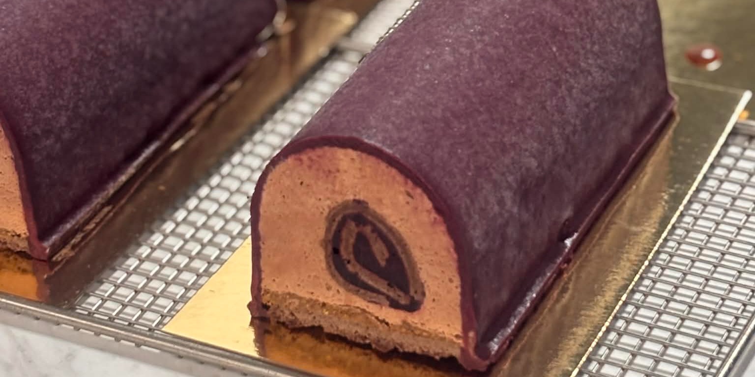 Elle se compose d'un glaçage aux camerises, une mousse chocolat noir, un gâteau roulée avec compotée de camerises et un croquant pralinée au tournesol et brisures de sablés cacao!