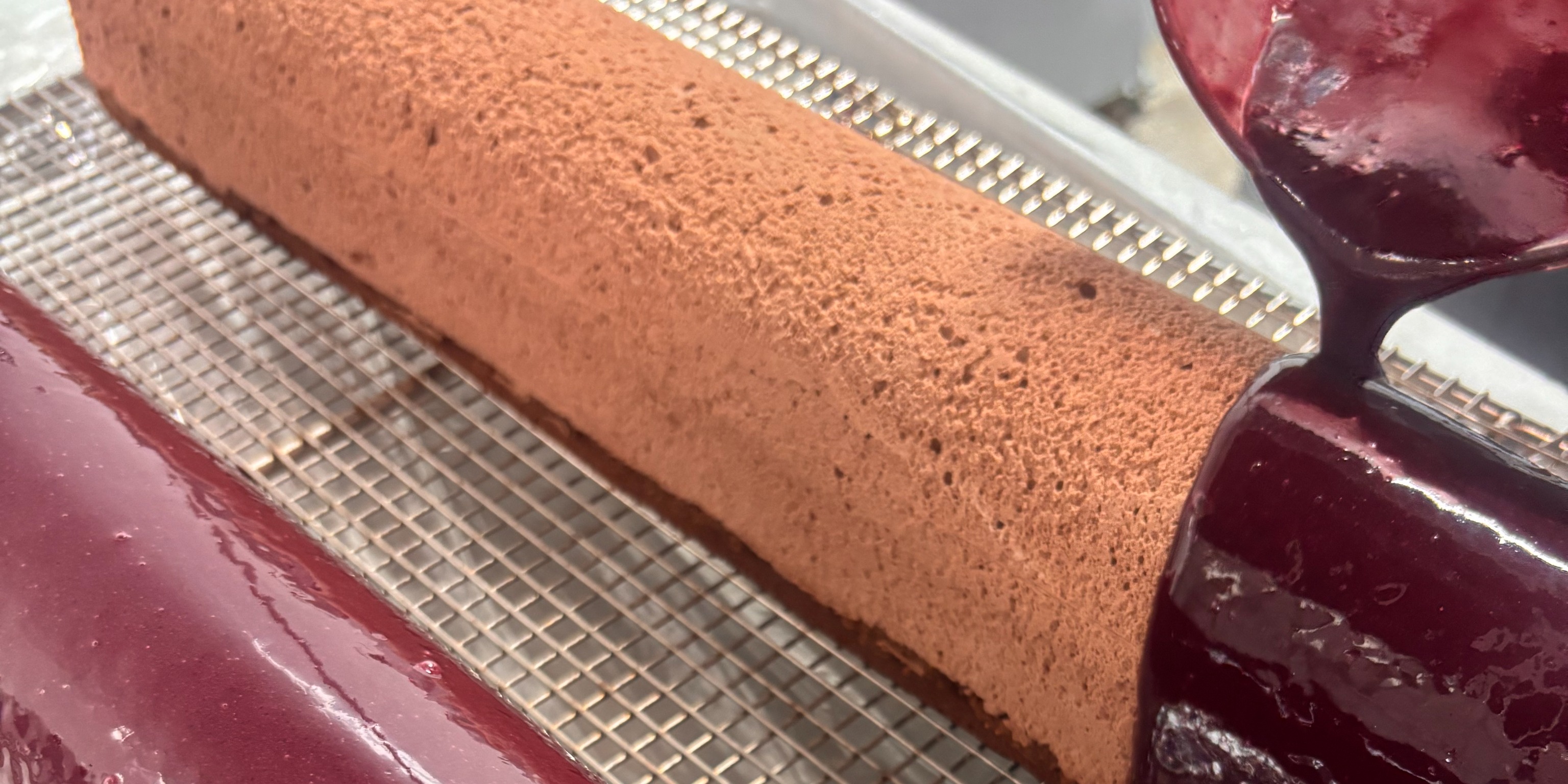 Glaçage camerise: eau, sucre, camerises des Petits fruits L'Islet, gélatine et chocolat noir Bassan
