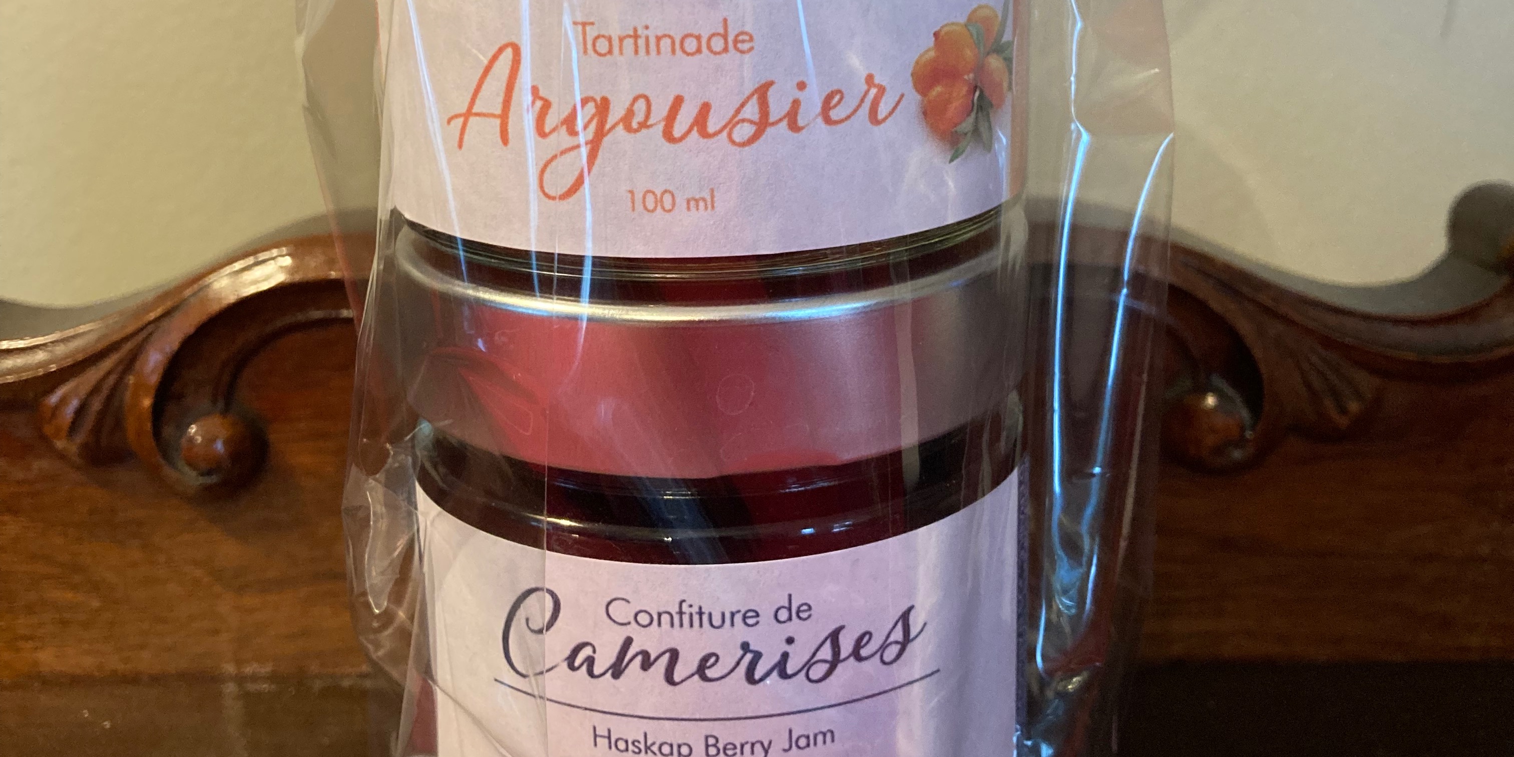 Confiture de camerises et tartinade d'argouses dans un emballage cadeau.