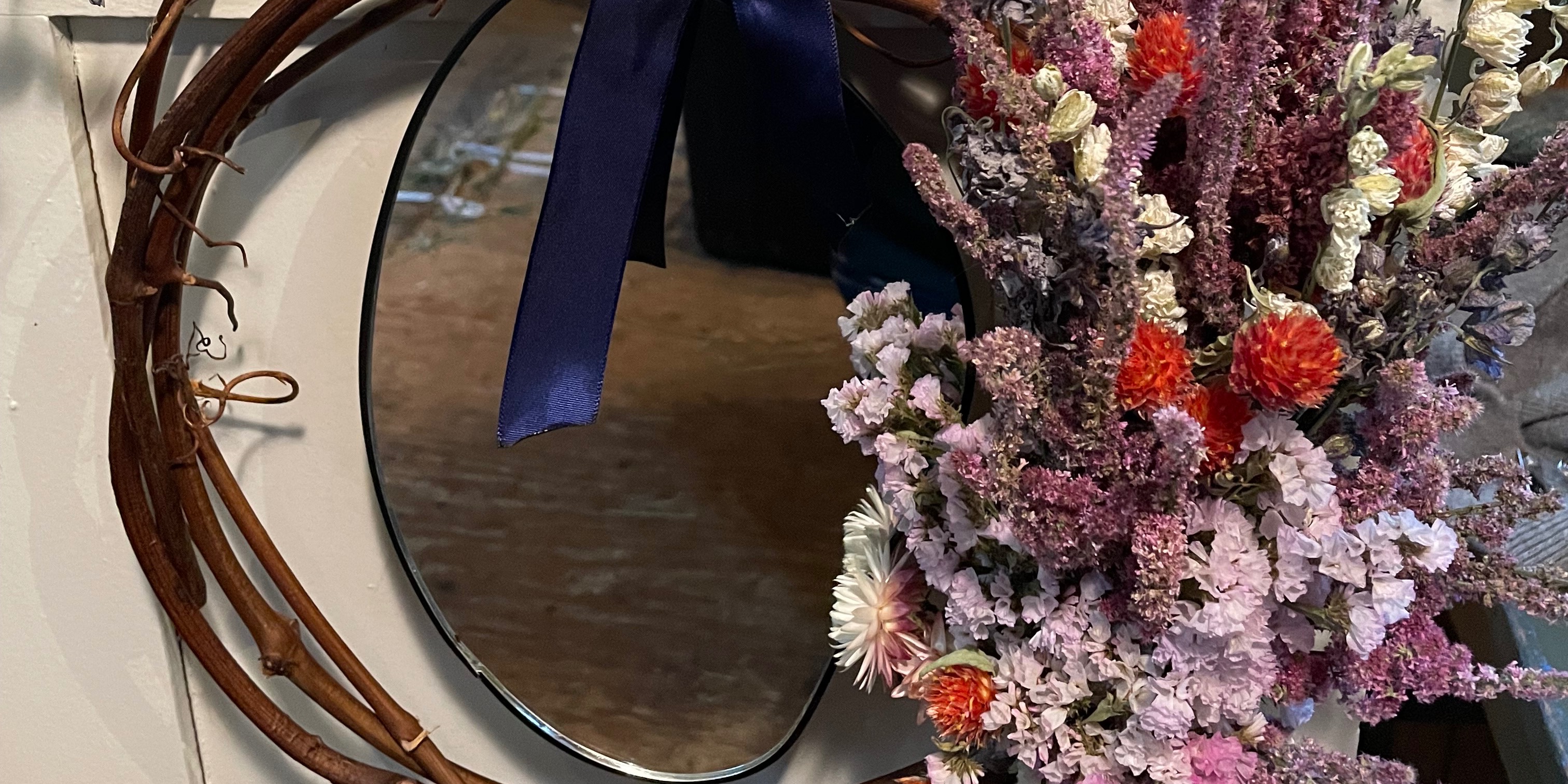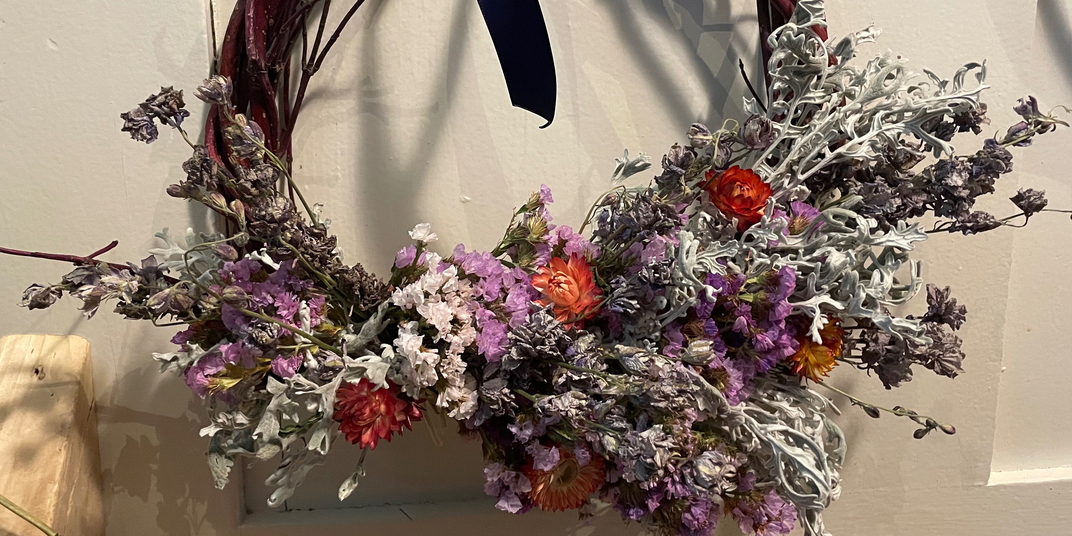 Des couronnes confectionnés à partir de branches de vignes et de fleurs séchées