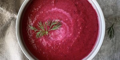 Crème de betterave et poire avec sa touche de gingembre et les herbes salées de retour au source