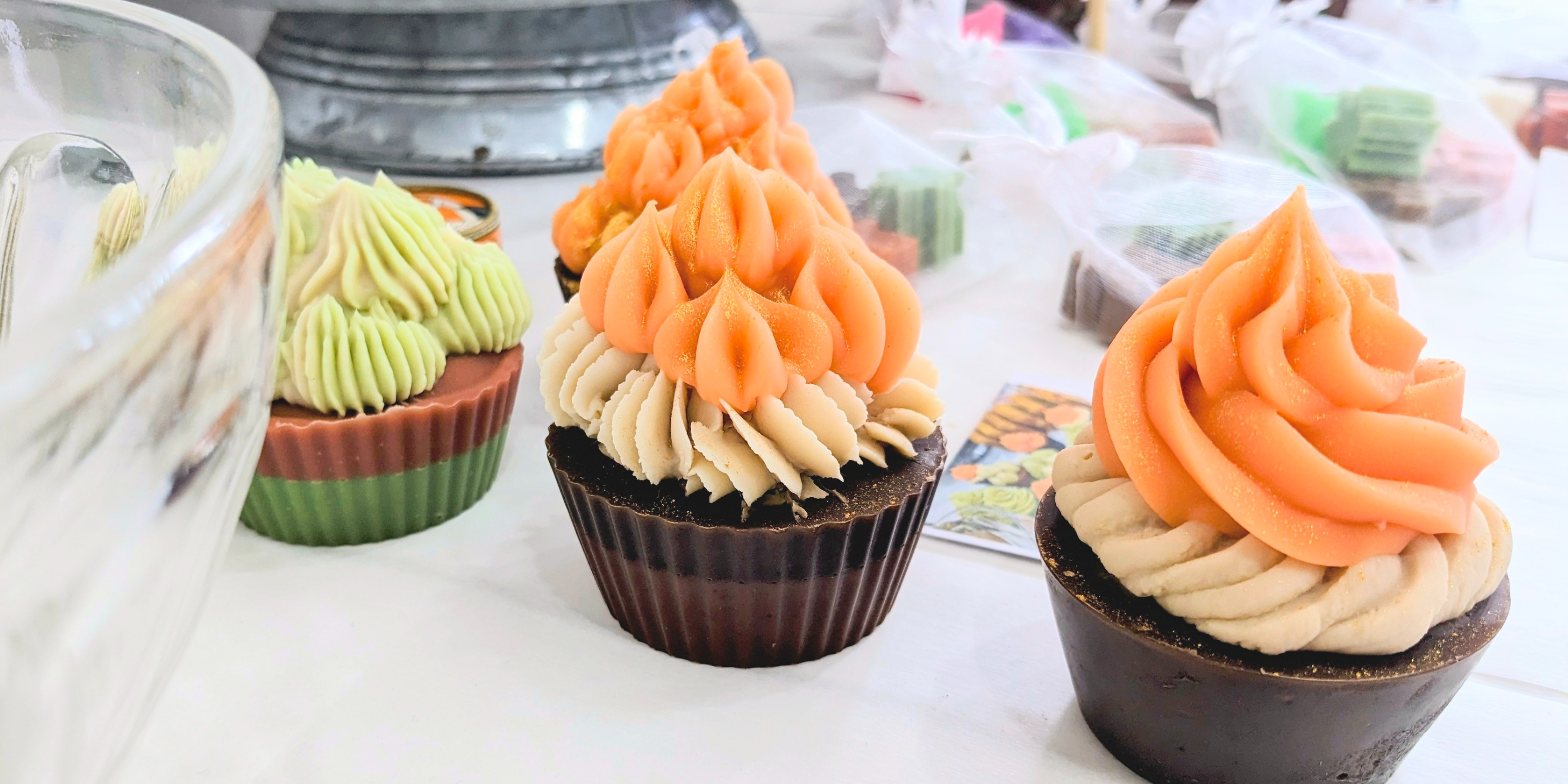 Découvrez ces deux fragrances d'automne à travers nos savons uniques! Chaque cupcake a sa touche originale, faits à l'aide de douilles à pâtisserie. Choisissez entre Pommes épicées ou Délice à la Citrouille!