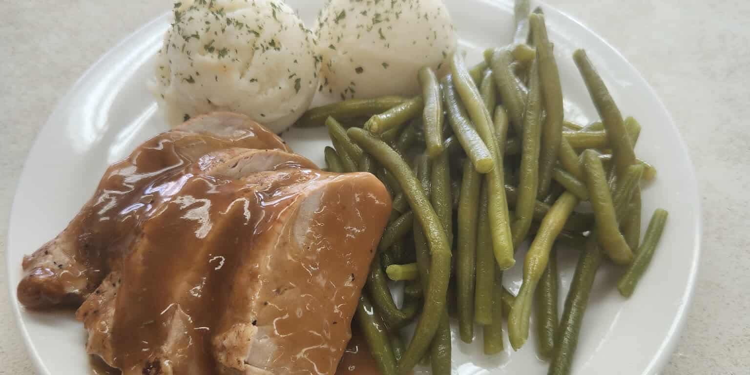 Ume portion de longe de porc fumé qui vous est servi avec une sauce d'accompagnement (orange et romarin), une purée de pomme de terre et des haricots verts.
