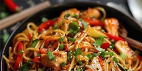 Pâtes alimentaires, poivrons rouges, poivrons verts, carottes, oignon, échalottes vertes, sésame, sauce soya, sauce hoisin, sel, poivre.