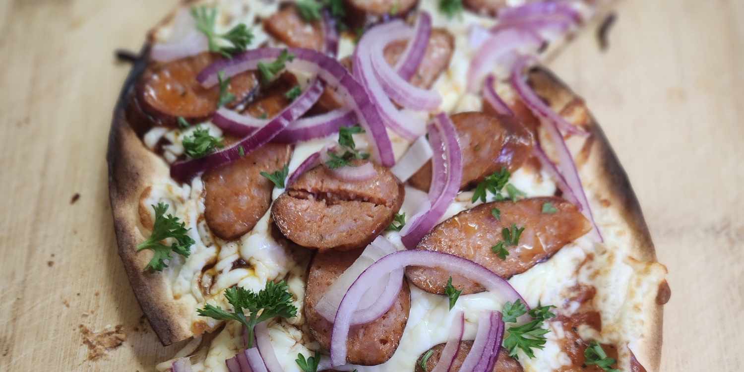 Pain naan, sauce tomate, saucisse buffalo locale, épices mélangées, mozzarella, oignons rouges, persil frais, sel, poivre.