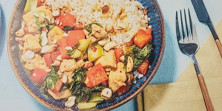 Poulet, poivrons, boychoys, riz, sauce soya, sauce chili, épices thaï, fécule de maïs, ail, sel, poivre
