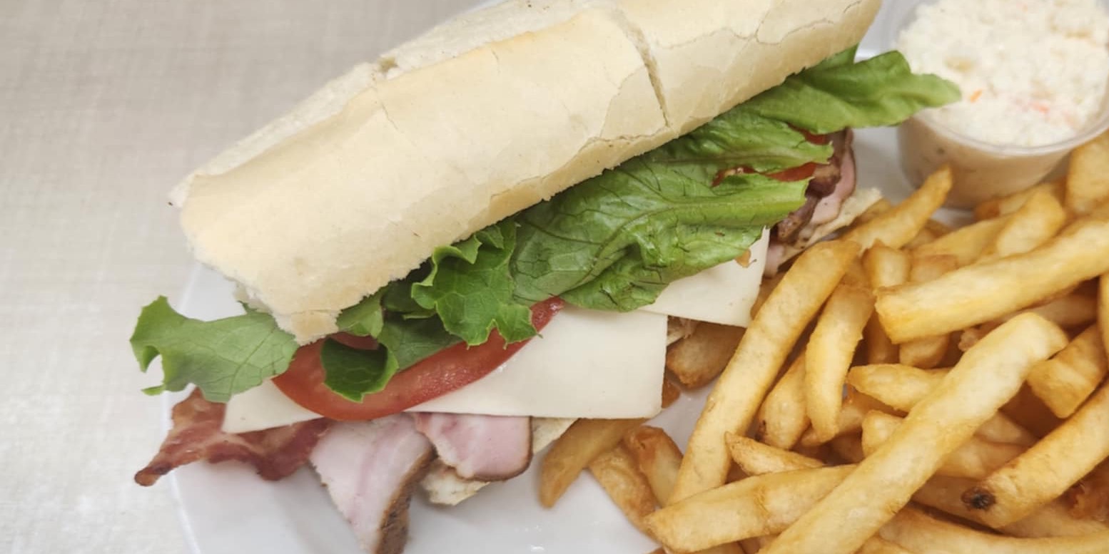 Pain baguette, porc, fromage, tomate,salade meslun.