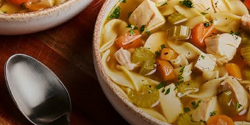 Soupe poulet, nouilles et légumes copieuse et réconfortante.